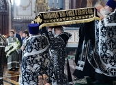 Предстоятель Русской Церкви совершил в Храме Христа Спасителя вечерню Великого пятка с выносом Святой Плащаницы