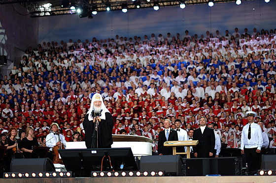 Поэтому, размышляя о том, как лучше отпраздновать День славянской письменности и культуры, многие из нас пришли к убеждению, что самым лучшим способом будет организовать всероссийский песенный праздник от Калининграда до Владивостока, центром которого является Первопрестольный столичный град Москва. И сегодня мы будем все вместе петь — петь от сердца, петь друг с другом, петь, создавая единый хор, единый хор размером во всю страну. Мы объединимся вокруг этого действа и почувствуем близость друг к другу, почувствуем значение народного единства.