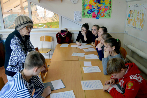 Урок «Мир в темноте» педагога Ольги Волковой многим запомнился необычной темой — знакомством с тем, как учатся читать и читают люди, не имеющие зрения. Гостями урока стали: специалист по тифлопедагогике (науке, занимающейся обучением незрячих) Александра Камынина, специалист в области компьютерной технологии для незрячих Роман Скрябин, а также массажист Марина Скрябина. Они рассказали детям о шрифте Ли Брайля для незрячих, о его истории и разработчике. Под руководством педагогов школьники и сами попробовали с помощью осязания прочесть написанное необычными символами слово «Бог».