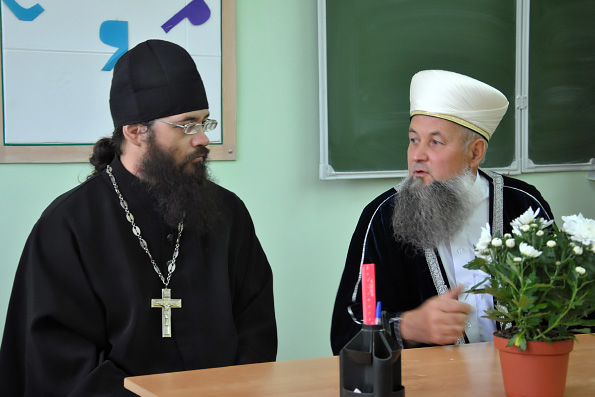 В рамках проходящего месячника «Экстремизму — нет!» для беседы с кадетами были приглашены руководитель миссионерского отдела Свято-Авраамиевского храма города Болгара иерей Алексий Ахметзянов и имам-мухтасиб Болгарской мечети Фархат хазрат Минсагиров.
