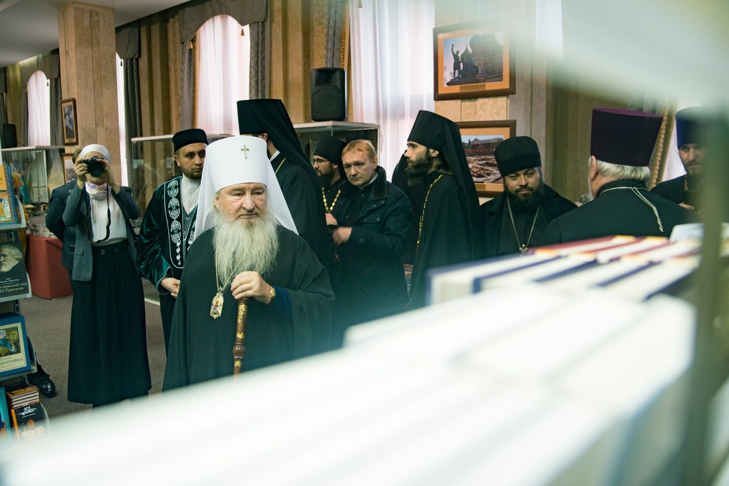 Затем состоялась экскурсия по выставке, где гостям рассказали о представленных экспонатах — главными из которых были книги. Особо были представлены труды Патриарха Кирилла, несколько книг из которых Владыка Феофан передал в библиотеку президента Татарстана Рустама Минниханова. Высокие гости также ознакомились с фото-экспонатами выставки «Светопись тайны», представленными в этом же зале.