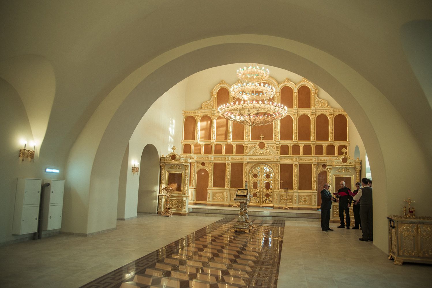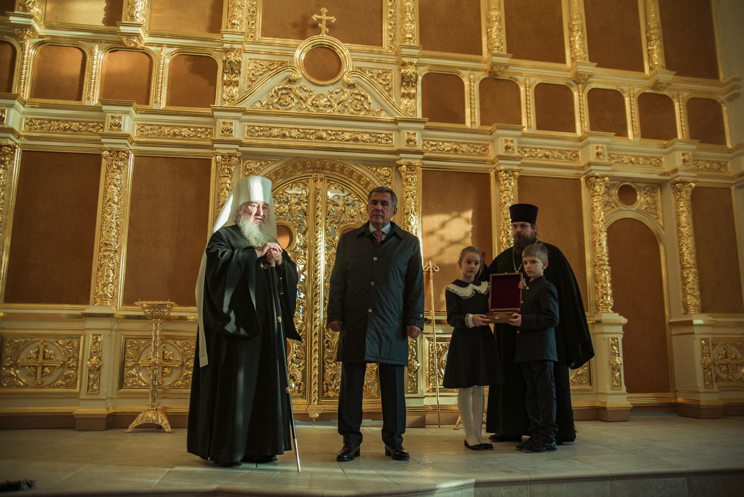 У входа главу республики встретил митрополит Казанский и Татарстанский Феофан. Архиерей коротко напомнил об истории создания и этапах реконструкции церковного здания.