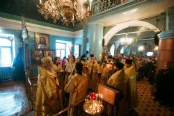 За Литургией Его Высокопреосвященству сослужили настоятель иерей Евгений Гаврилкин с клириками прихода, благочинный I Казанского округа протоиерей Алексий Чубаков, настоятель Свято-Введенского Кизического мужского монастыря игумен Пимен (Ивентьев), настоятель храма великомученицы Параскевы Пятницы города Казани иерей Алексий Обрывко.