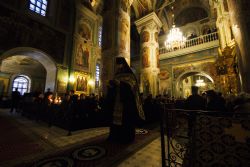 Песнопения вечернего богослужения исполнялись архиерейским мужским хором под управлением Дениса Рогова.