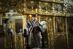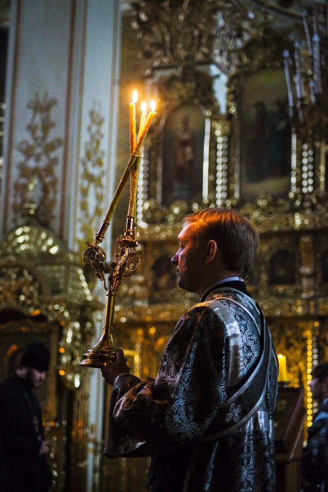 Песнопения повечерия исполнял архиерейский мужской хор под управлением Дениса Рогова.