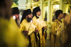 Песнопения вечернего богослужения исполнялись двумя монастырскими хорами: мужским под управлением Дениса Рогова и смешанным под управлением монахини Амвросии (Кочережкиной).