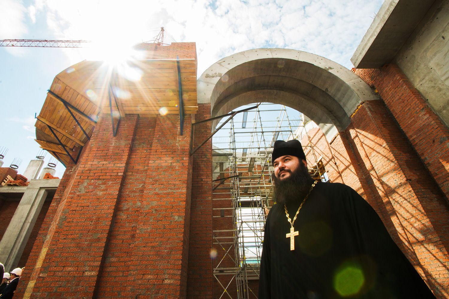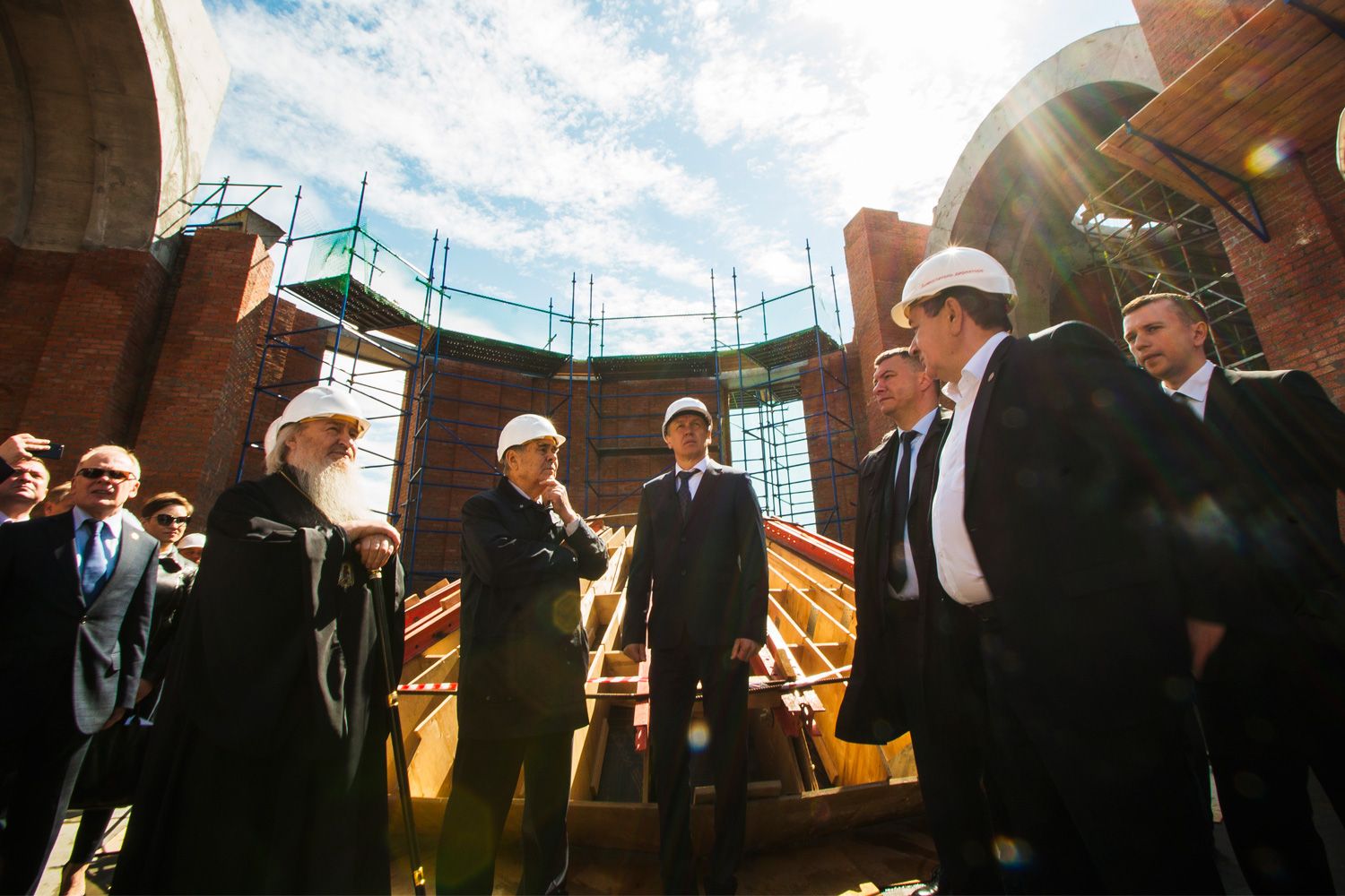 На строительной площадке генеральный директор подрядной организации ООО «Евростройхолдинг+» Владимир Казилов ознакомил участников рабочей встречи с ходом работ, которые активно продолжались осенью и зимой 2016-2017 гг. На сегодняшний день выполнены работы по устройству всех 24 колонн и 6 полуколонн, перекрытия клироса, стен тамбуров, сводов и куполов. Продолжается устройство нижних сводов, водопровода и теплоснабжения, кладочные работы несущих стен.