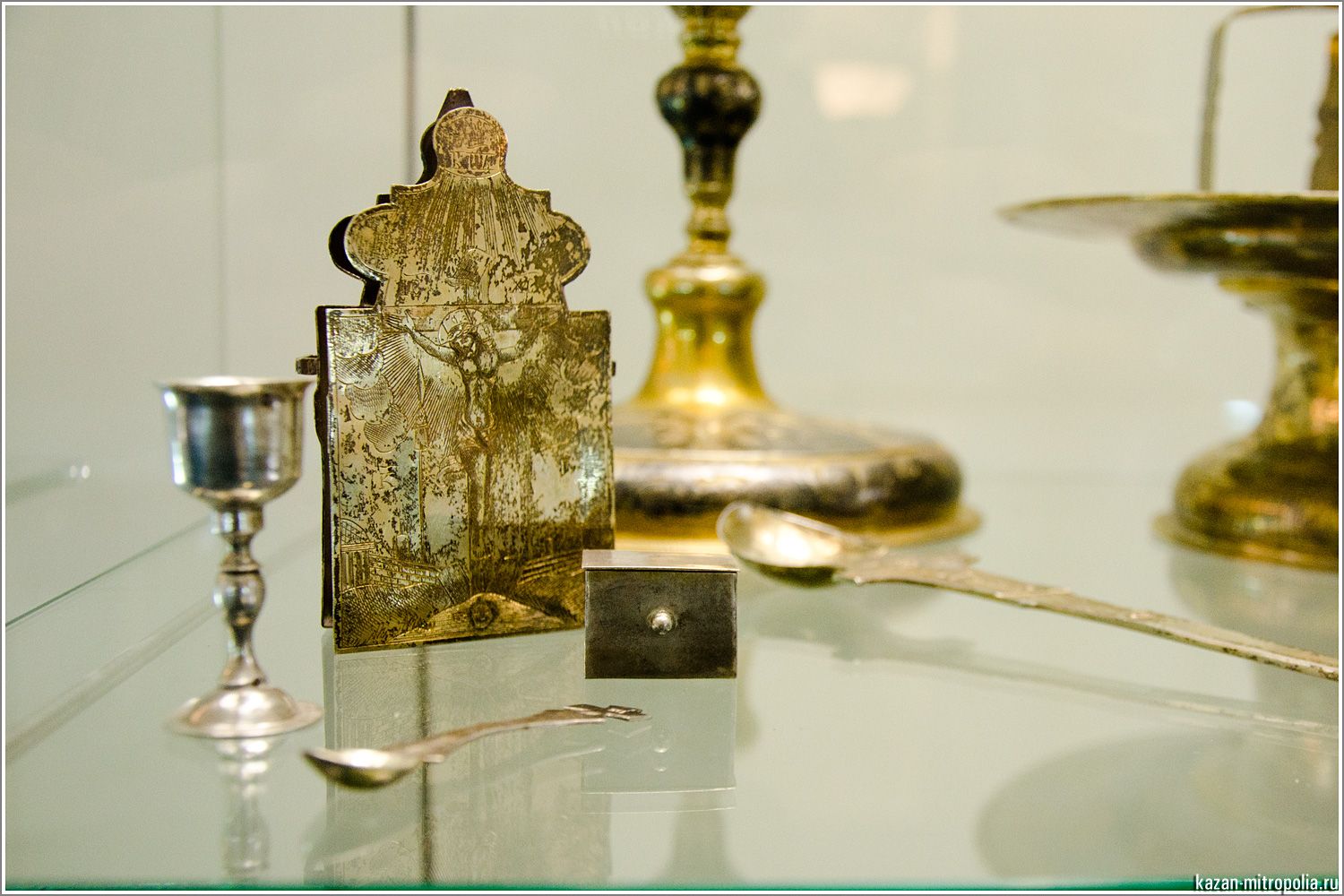 В экспозиции представлены комплексы ценнейших памятников церковного искусства — иконы XVII — XVIII вв, произведения лицевого и орнаментального шитья XVI — XVIII вв., выполненные в казанских и строгановских мастерских, предметы из серебра XVI — XIX вв. — священные сосуды для Таинства Причастия (потиры, дискосы, звездицы, дароносицы), напрестольные кресты, миниатюрные иконы-панагии, предметы церковной утвари (ладанницы, кадила) и др. В экспозиции находятся иконы, рукописные книги и предметы богослужения.