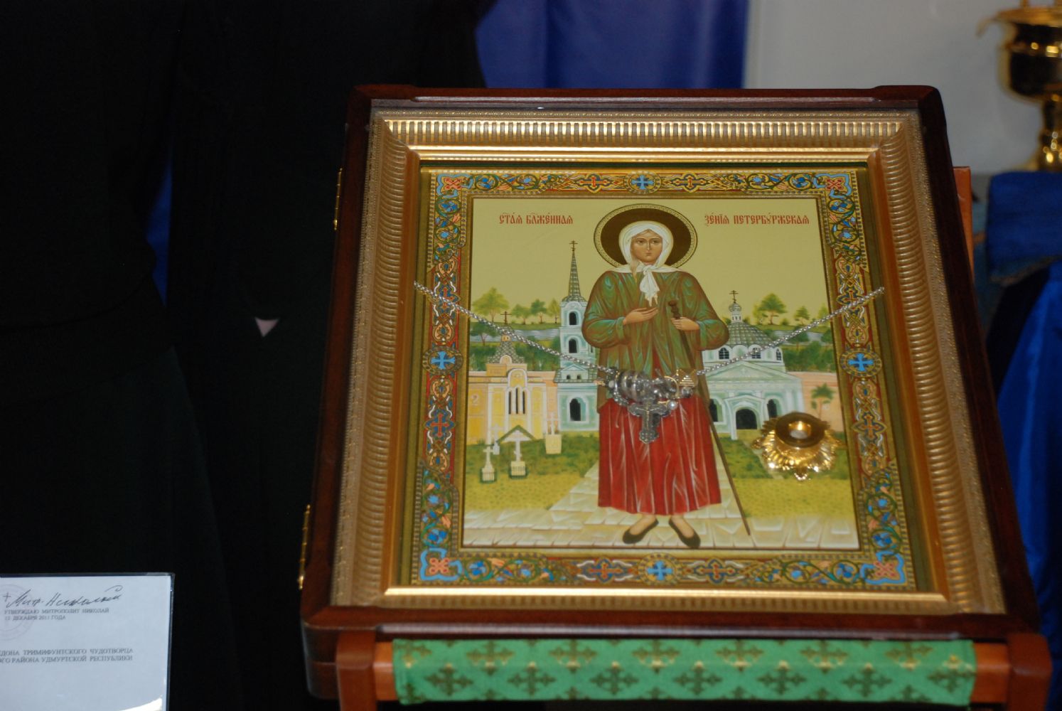 Кроме того, для поклонения верующим на выставку привезены три чтимые святыни - это чудотворная икона Божией Матери «Неупиваемая Чаша» из Серпуховского женского монастыря, а также чудотворная икона блаженной Ксении Петербургской и икона святителя Спиридона Тримифунтского с частицей мощей.