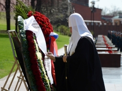 В канун 68-й годовщины Победы в Великой Отечественной войне Предстоятель Русской Церкви и духовенство г. Москвы возложили цветы к могиле Неизвестного солдата у Кремлевской стены