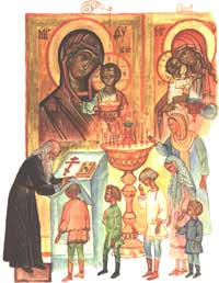 После положенных священнодействий, вознесения молитв священником, совершающим таинство, и всей церковью, причастники приближаются к ступеням алтаря. Детей пропускают вперед, они причащаются первыми. Дети в